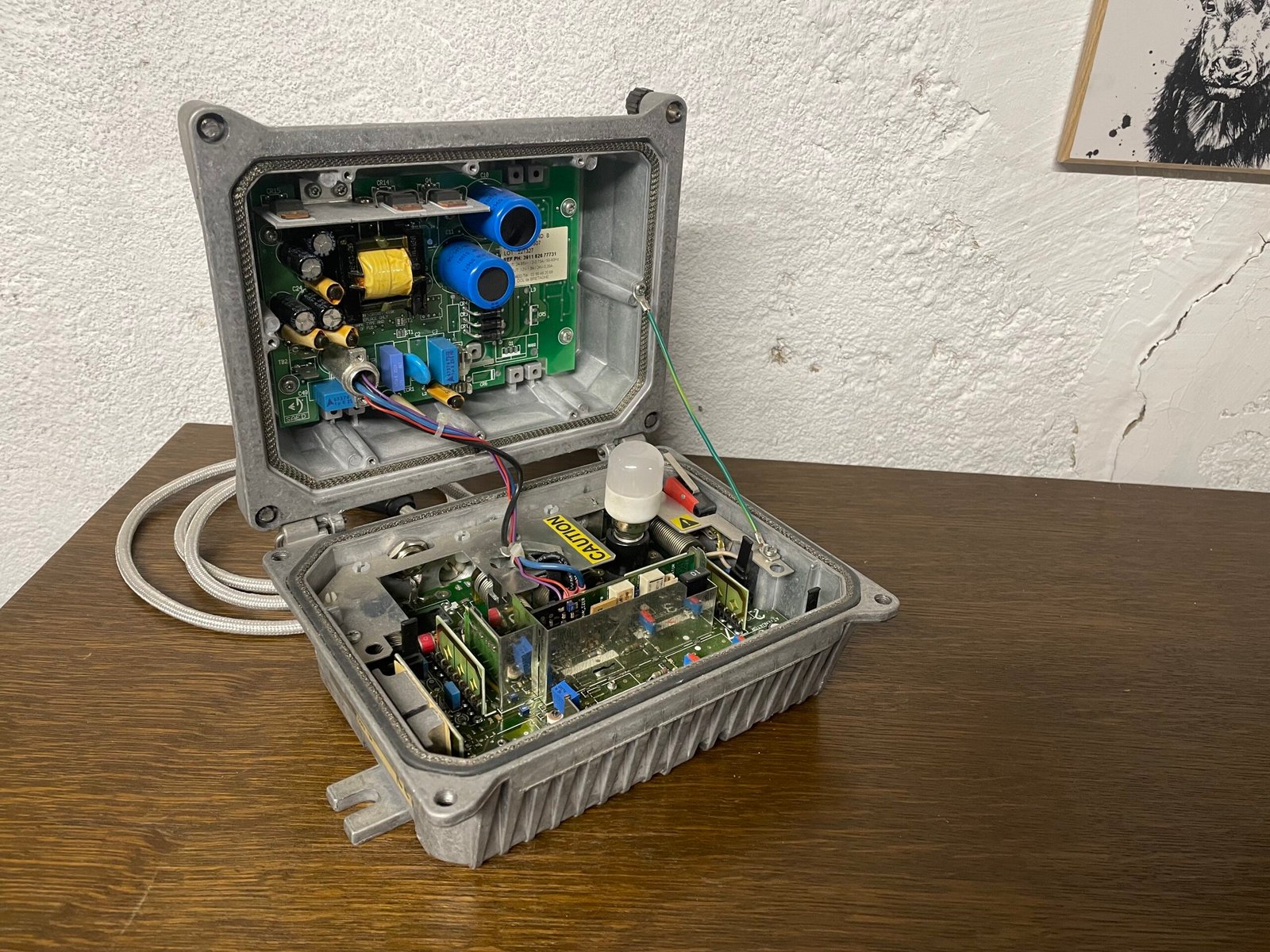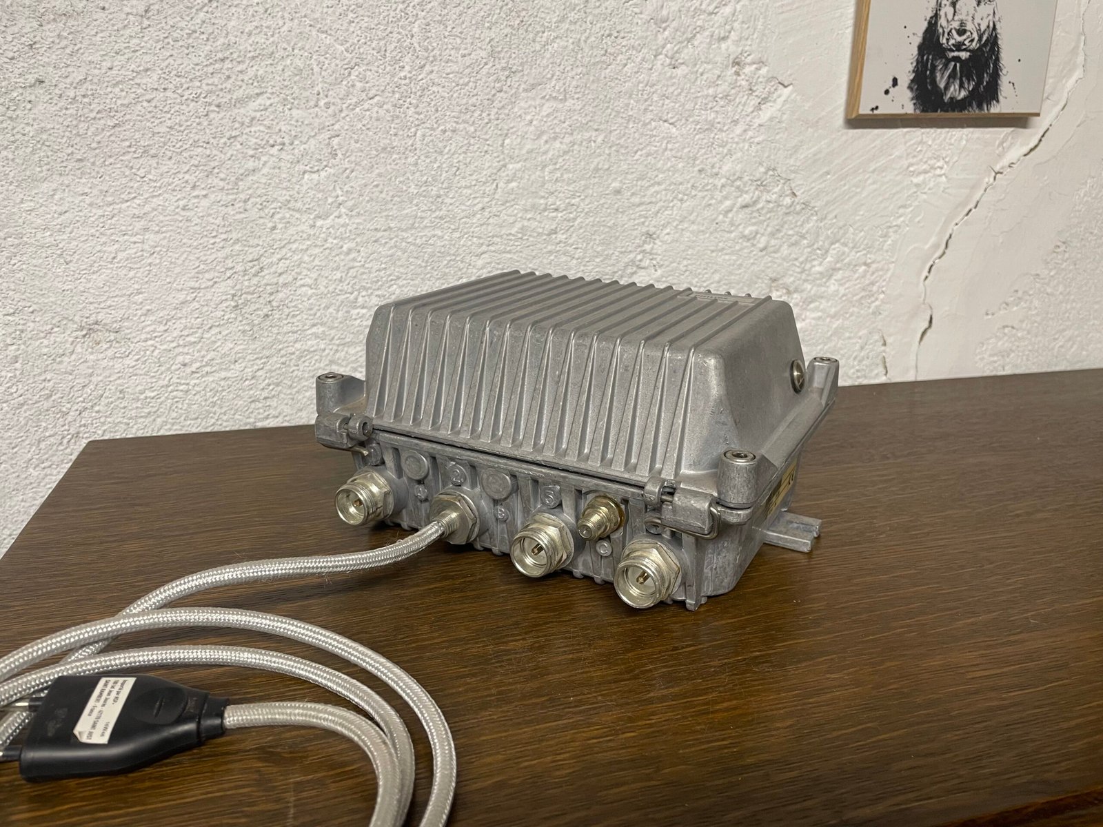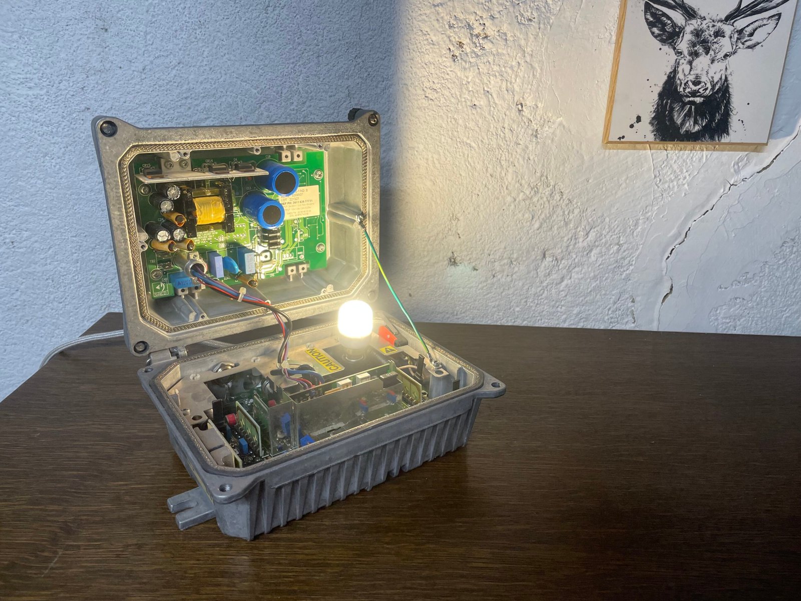 Très original crée à partir d’un amplificateur de réseaux de télévision. Le couvercle s’ouvre et l’on peut découvrir ces “entrailles”. Elle s’allume et s’éteint automatiquement à l’ouverture ou à la fermeture.