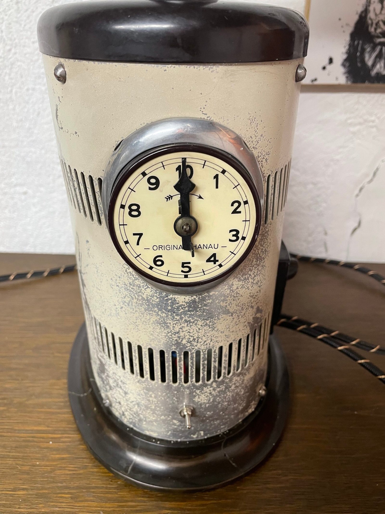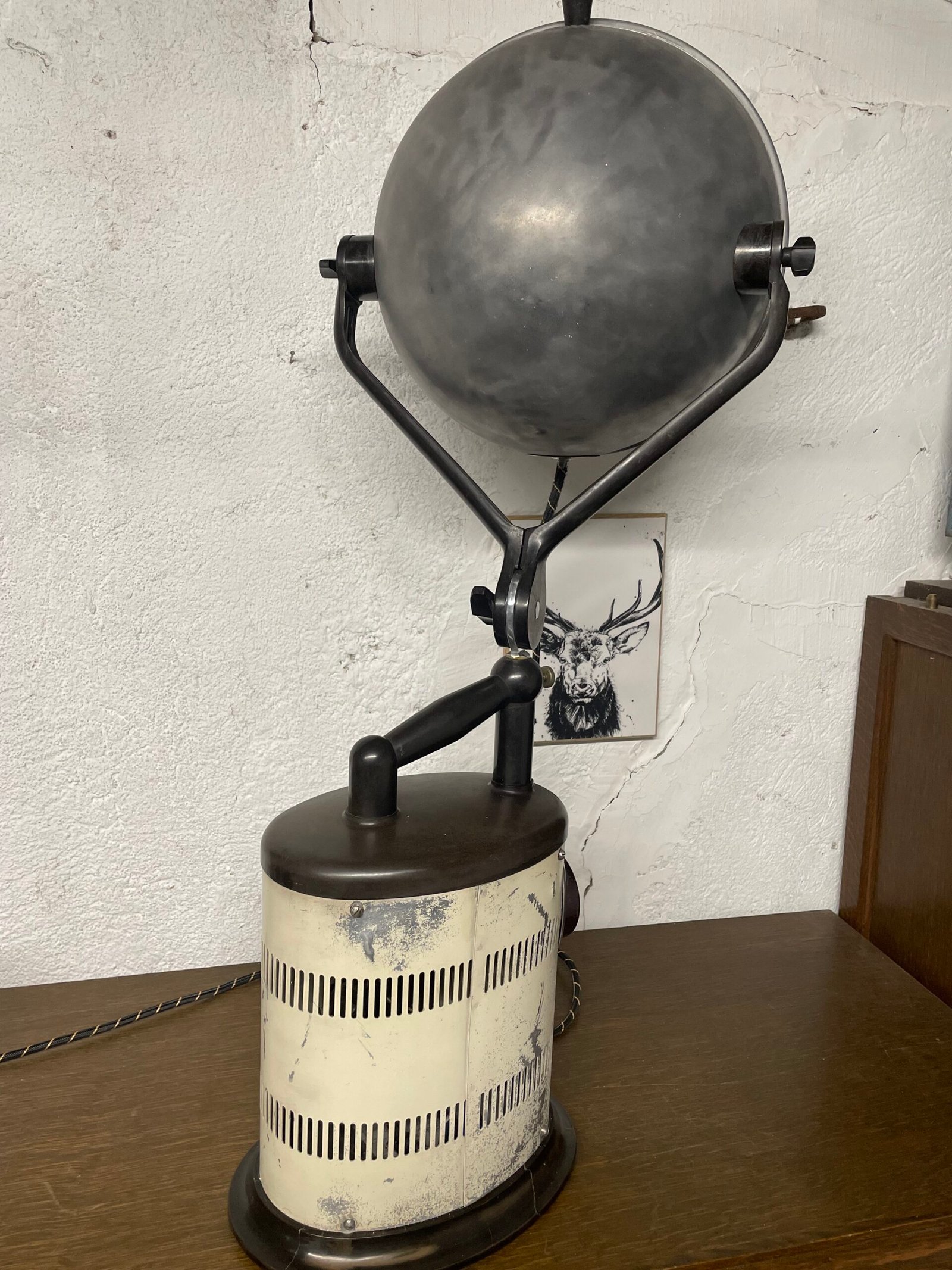 Belle lampe, assez rare, élaborée à partir d’une lampe à bronzer ou solaire de marque Hanau. Socle et poignée en Bakélite, le reste est en aluminium. Sur sa face avant, la minuterie, qui fonctionne encore et j’ai rajouté un discret interrupteur à bascule pour l’allumer.